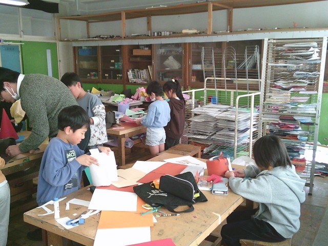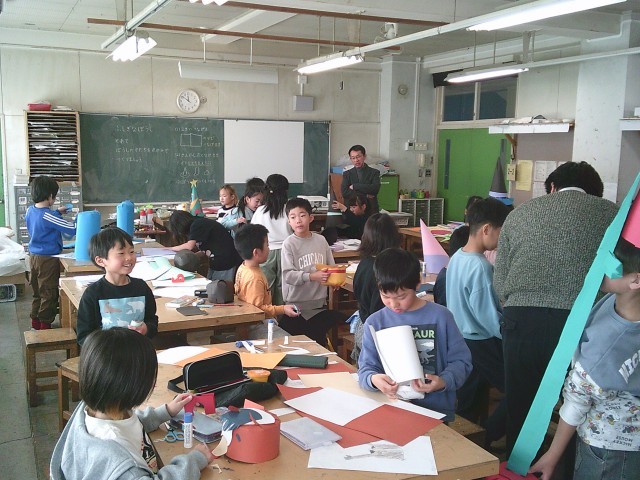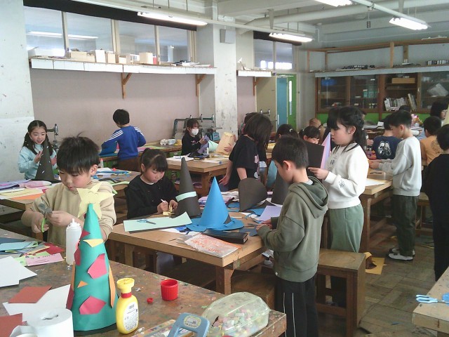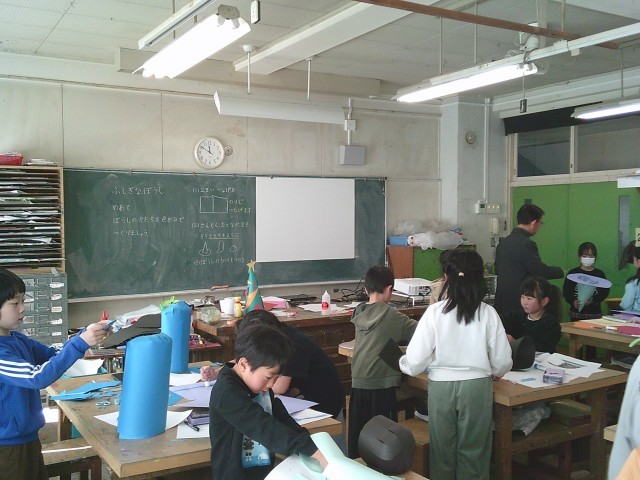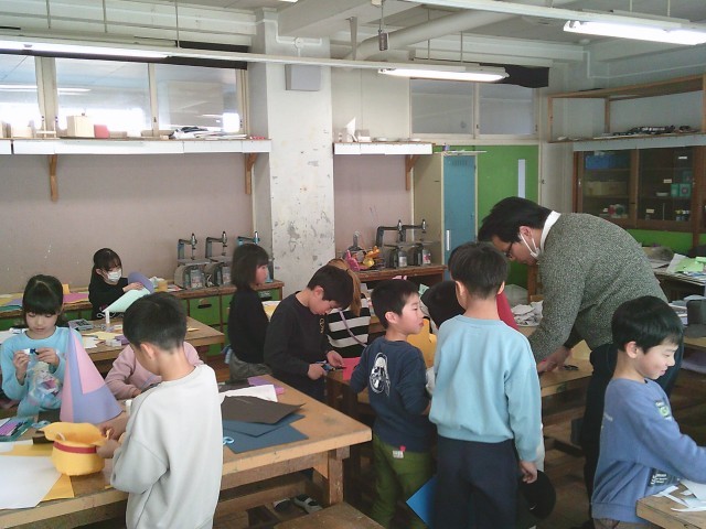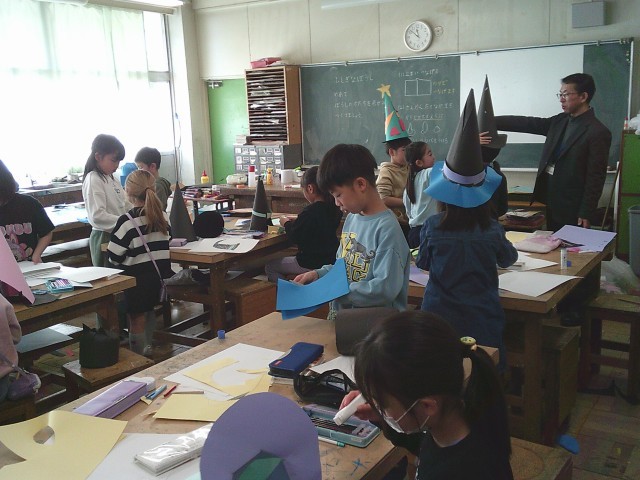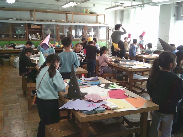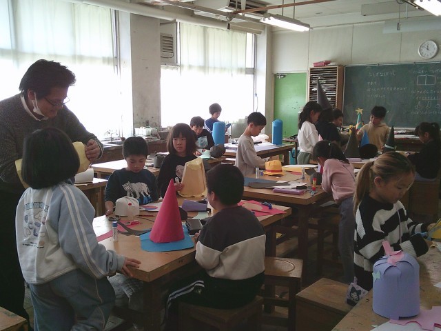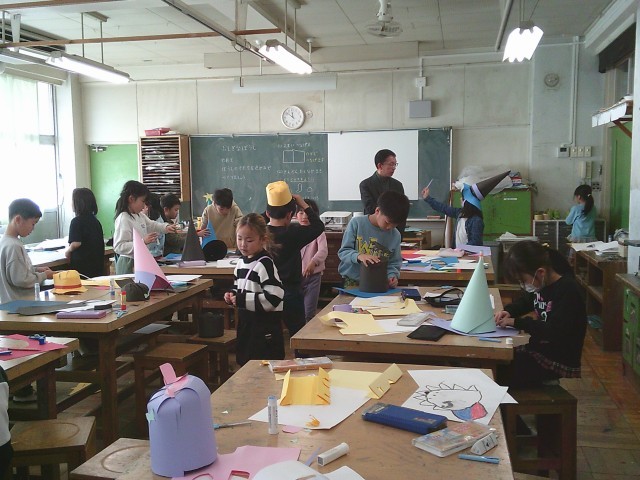 16日(金)3・4時間目、2年2組は図画工作の時間でした。「ふしぎな ぼうし」と題した工作が始まりました。今回は、帽子の形を色紙で作ることをめあてに取り組みました。画用紙を2枚つなげて、三角や縦長、丸といった帽子の形を選びました。