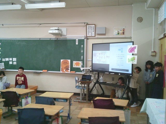 19日(月)2時間目、1年1組は外国語活動の時間でした。担任の先生の他にMepsの先生も参加しました。今回は「好きな動物を聞いたり、答えたりしよう」をめあてに学習をしました。馬、アヒル、鳥、ネコなど8種類の動物を英語で発音したり、教室の四隅に2枚ずつカードを置いて楽しむゲームをしたりしました。