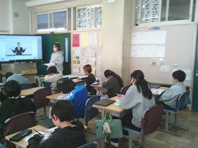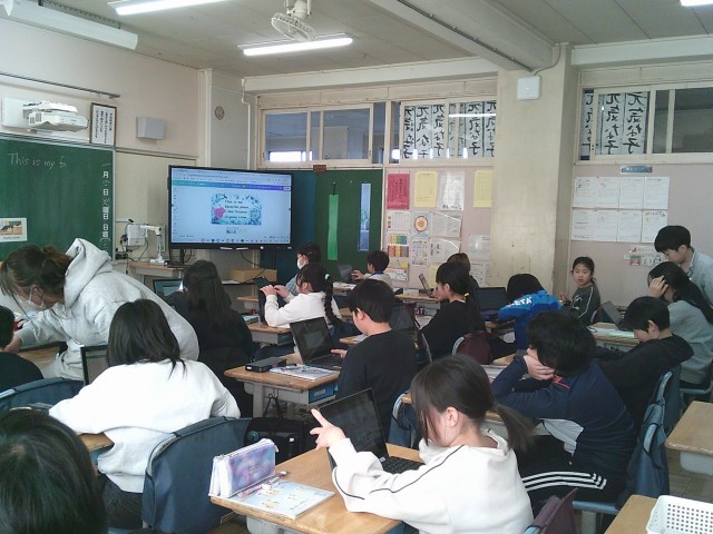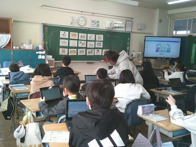 20日(火)1時間目、4年1組は外国語活動の時間でした。「This is my favorite place.」の単元を学習しています。今回は、学校の中でお気に入りの場所を動画から聞き取ったり、タブレット端末を使って「お気に入りカード」を作成したりしました。