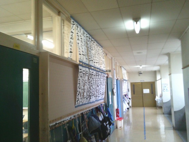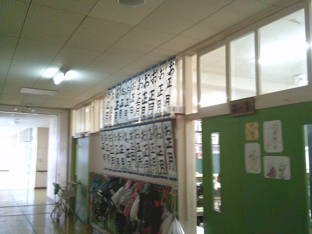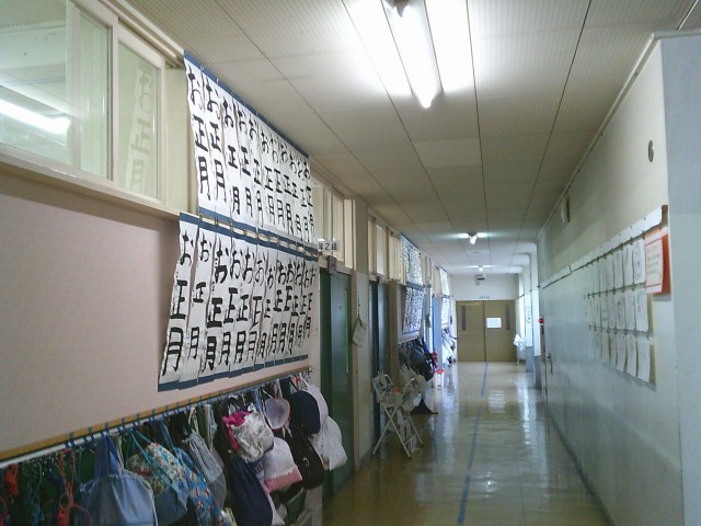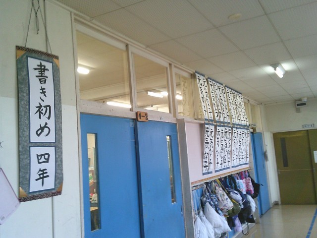 3年生と4年生の廊下には、書き初めの作品が展示されました。3年生以上の作品には、上部分と下部分に紺色の画用紙を貼っています。