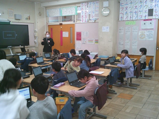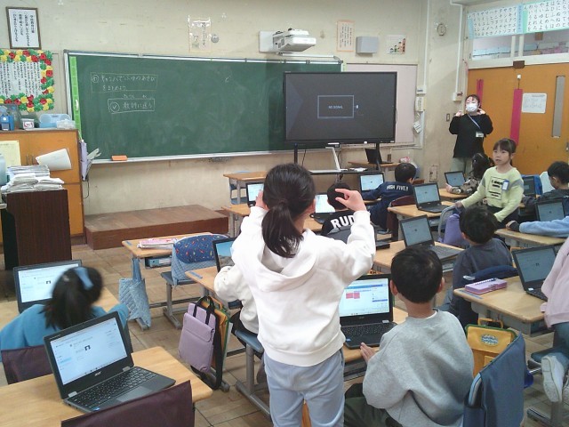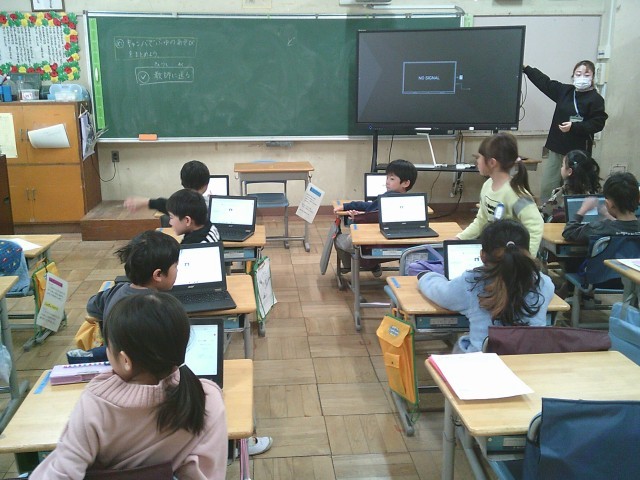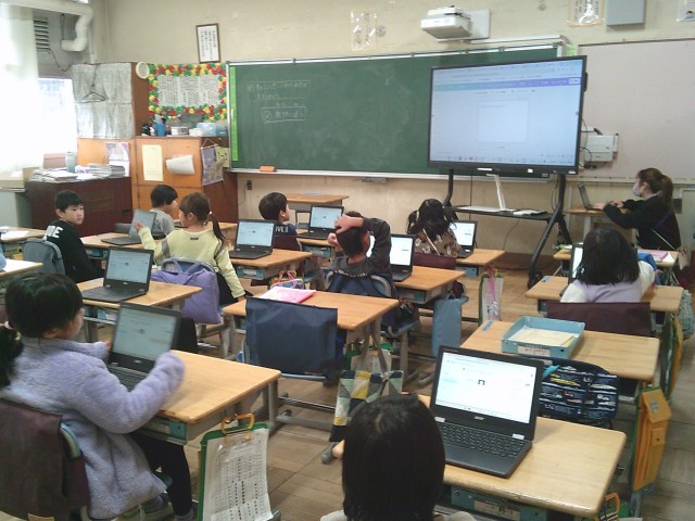21日(水)2時間目、1年2組は生活の時間でした。タブレット端末を使って「ふゆのあそび」をまとめていました。CANVAというアプリを操作しながらまとめるため、近くの人同士で教え合う姿もありました。