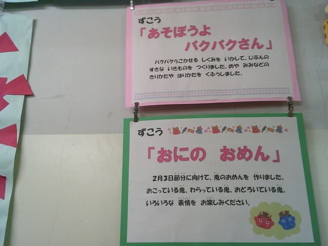 1年生の廊下には、書き初めの他に図画工作の時間に取り組んだ2つの作品が飾られています。「あそぼうよ パクパクさん」と「おにの おめん」です。