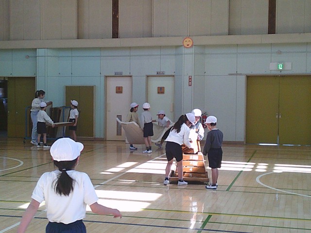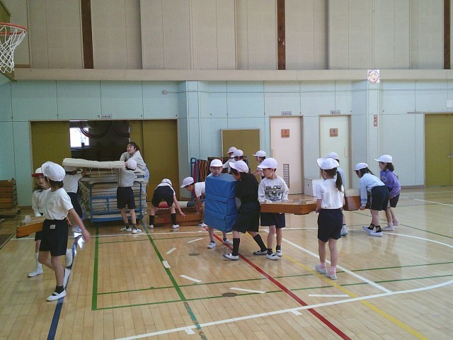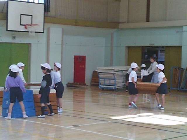22日(木)3時間目、1年2組は体育の時間でした。「跳び箱あそび」学習終わりの時間となり、片付けを始めていました。どれを片付けるのかは決めず、子どもたちが互いに声をかけ合って、マットや跳び箱を運んでいました。片付けが終わると体育館の入口に並び、最後の確認をする先生を待つことができました。