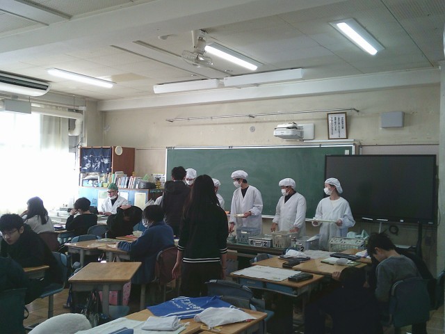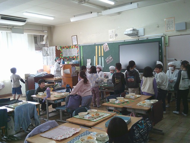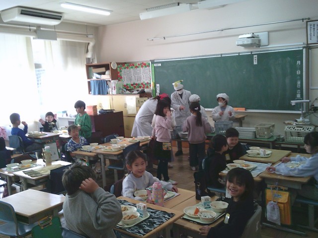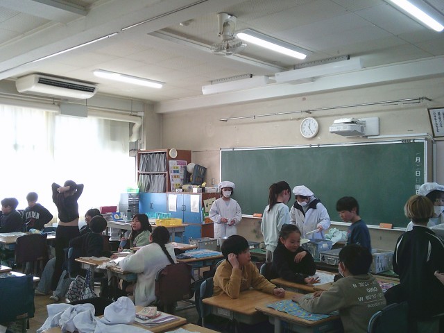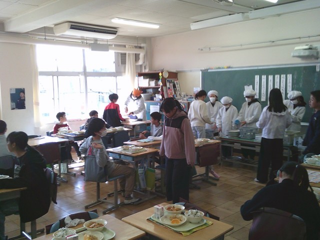 22日(木)給食準備の様子です。4時間目は12時10分に終わりますから、そこから一斉に準備を始めます。4時間目の時間割によっては準備に時間を要することもあります。本日はどこの教室に行っても「キムチチゲ」の香りがしていました。写真は、1年1組、1年2組、4年2組、6年1組、6年2組です。