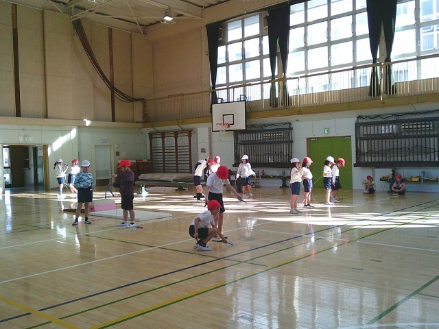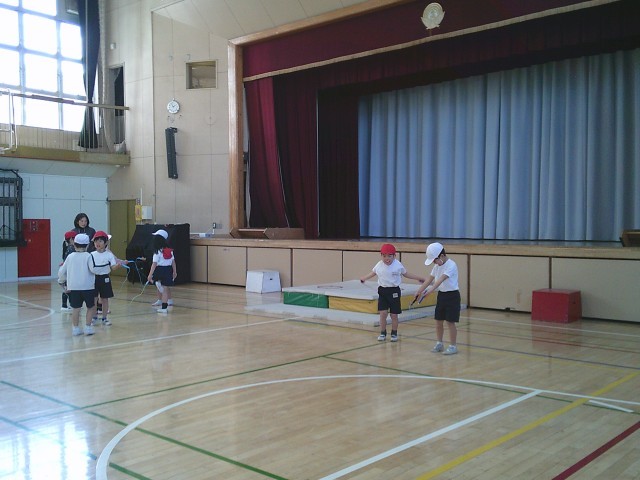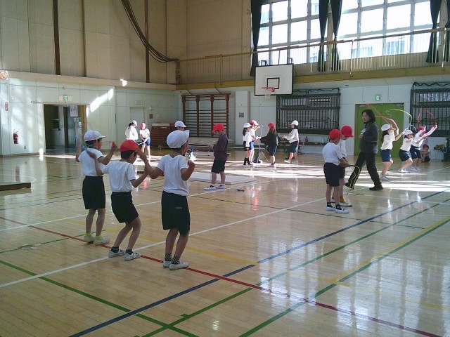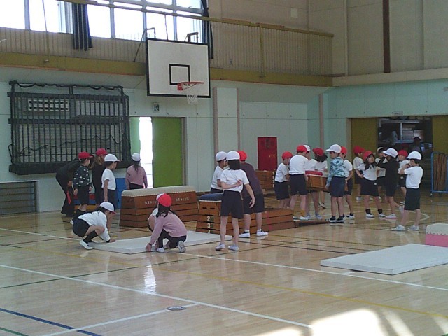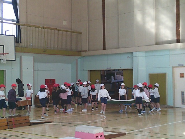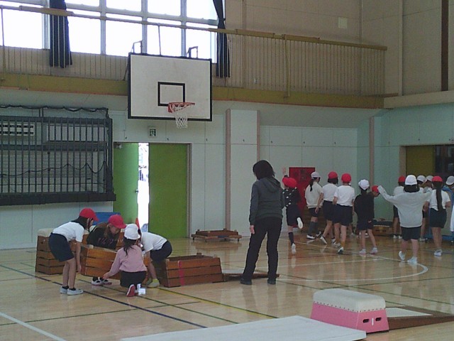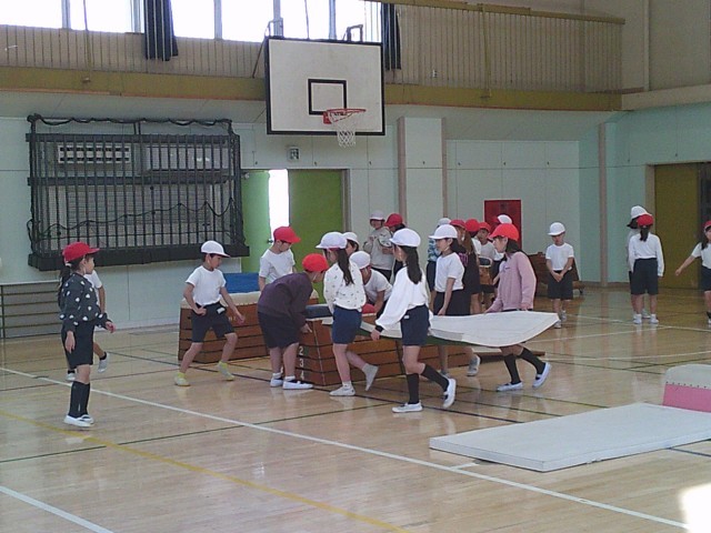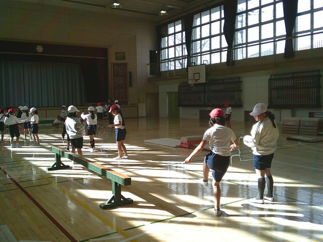 22日(木)5時間目、2年1組は体育の時間でした。最初になわ跳びの練習をしました。二人跳び、三人跳び、四人跳びなど、子どもたちは近くにいる友達と楽しみながら跳んでいました。次に、とび箱運動あそびの準備をしました。子どもたちはすすんでマットやとび箱を運んでいました。