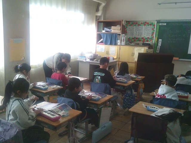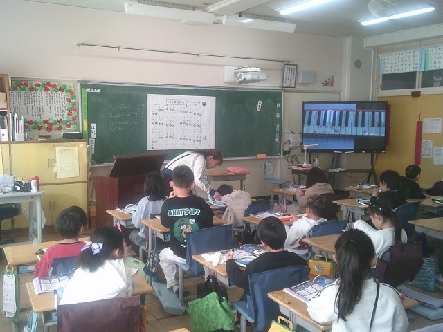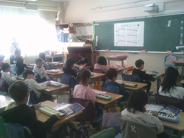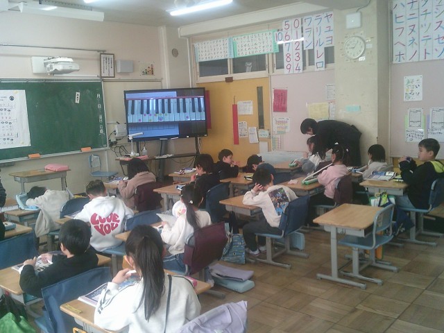 23日(金)1時間目、1年1組は音楽の時間でした。今月の歌「ふるさと」を歌ってから、鍵盤ハーモニカを出して「きらきらぼし」の練習をしました。個人練習の時間を設け、その間に音楽の先生が一人ずつ演奏を聞いて周りました。演奏ができた人はシールをもらいました。