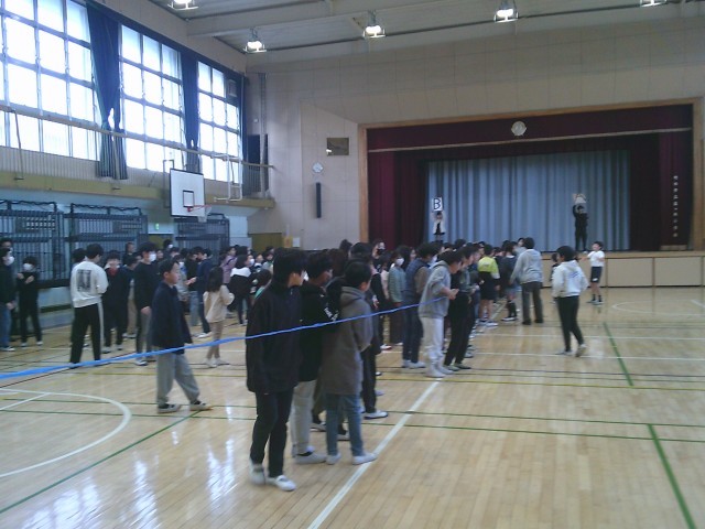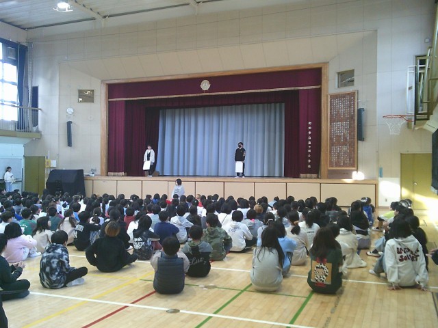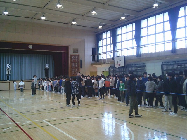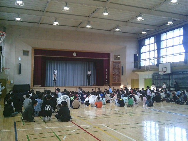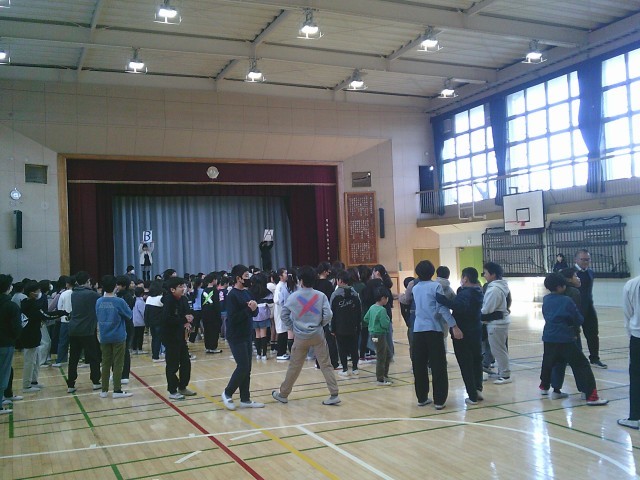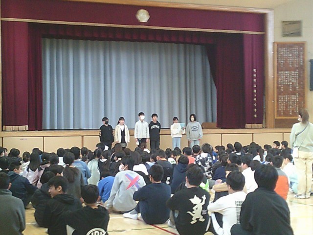 26日(月)の朝は、集会をしました。今回は「イントロクイズ集会」です。AかBかの2択で、子どもたちは正解だと思う場所へ移動します。クイズは全部で6問ありました。月曜日の朝、楽しいひとときを過ごしました。
