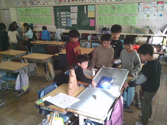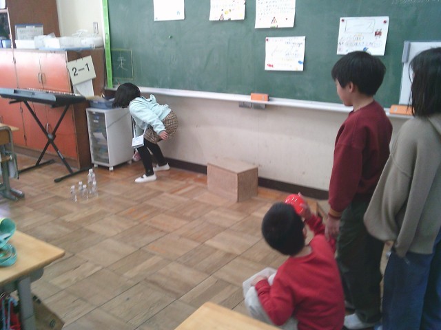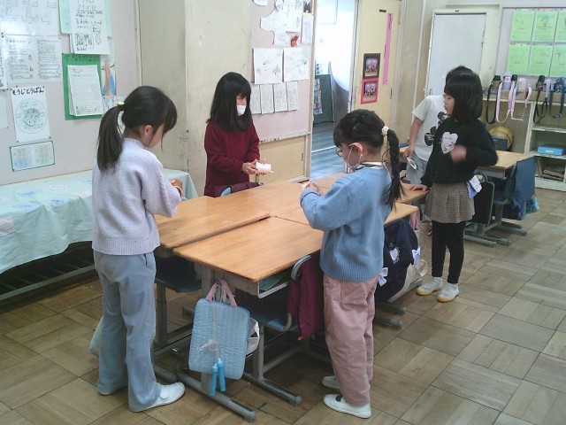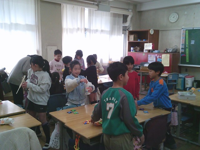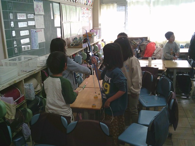 26日(月)5時間目、2年生は学年合同で生活の時間でした。「あそんで作ってくふうして」の学習です。自分たちが作ったおもちゃを使って遊びました。「こどもまつり」のように前半チームと後半チームに分かれて取り組みました。子どもたちの作ったおもちゃはどれも素晴らしいです。