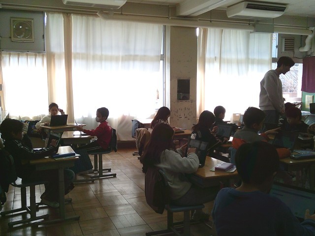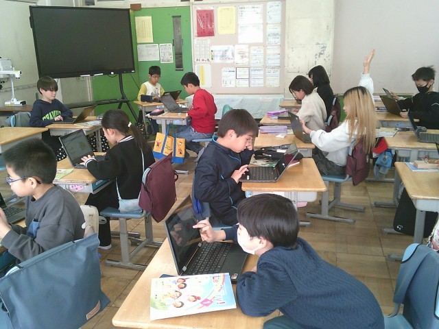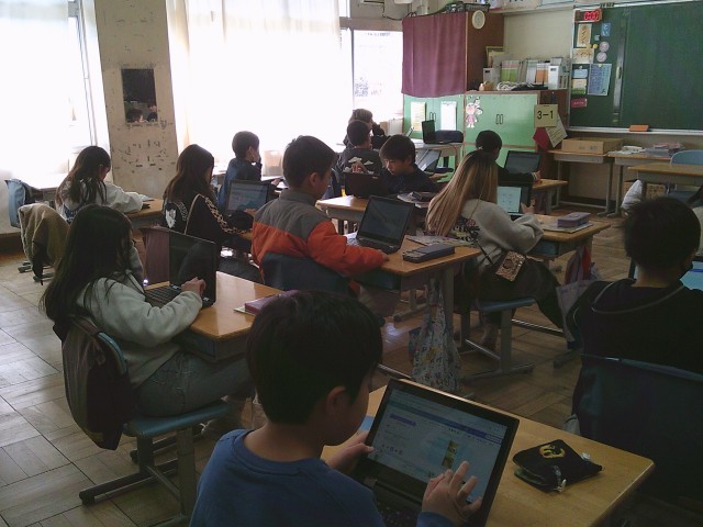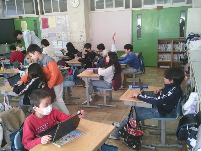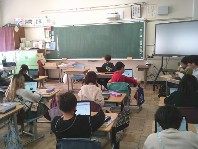 27日(火)4時間目、3年1組は外国語活動の時間でした。「What's this?」の学習をしています。タブレット端末を使って一人3問ずつ「What's this?」と題した問題作りをしました。友達に知られないようにと机の向きを変えて作成している人もいました。クイズ大会が楽しみです。