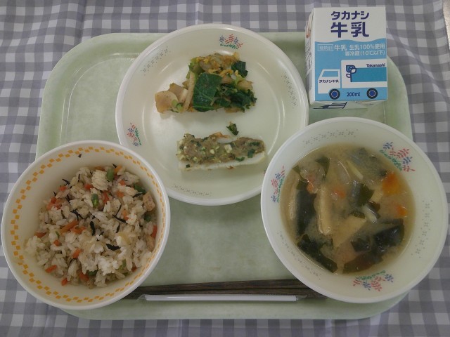 28日(水)の献立は、五色ご飯、ちくわの肉詰め焼き、かぶと白菜のおひたし、栄養みそ汁、牛乳です。