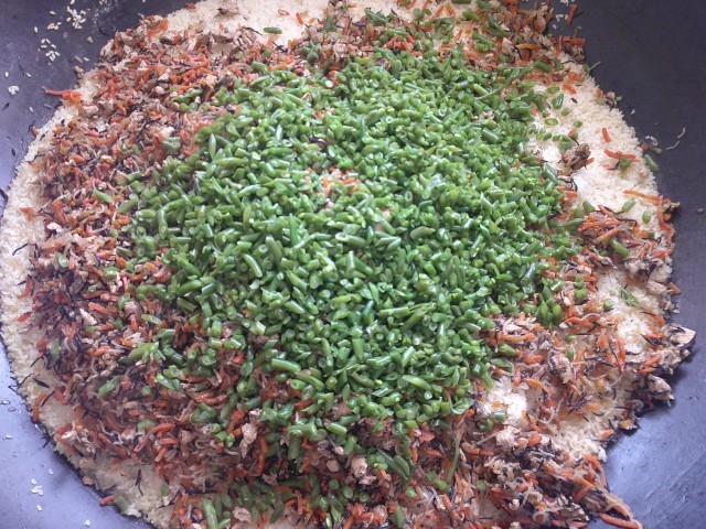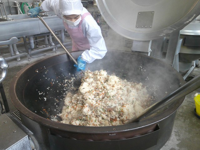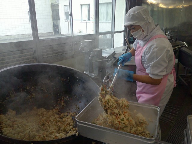 今日は大正時代の給食から、「五色(ごしき)ご飯」の登場です。五色とは、青(緑)、赤、黄、白、黒(紫)をさし、魔除けや健康、見た目の美しさを表現しています。今日はさやいんげん、鶏肉、人参、白滝、大根、ひじきの五色の食材を使いました。