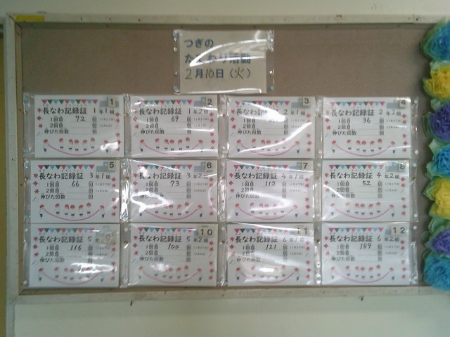 長なわ記録証がたてわり班活動で使用する掲示板に登場しました。27日(火)にとった1年1組から6年2組までの記録です。2月6日(金)に2回目の記録をとるので、それまでに跳ぶ回数がどれだけ増えるのか楽しみです。