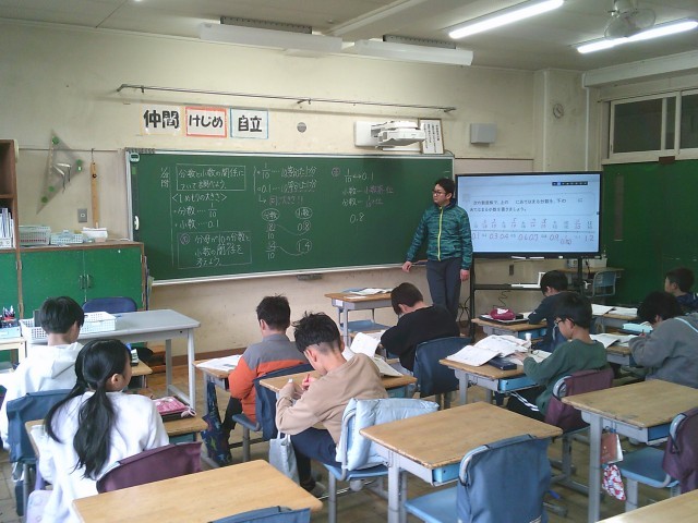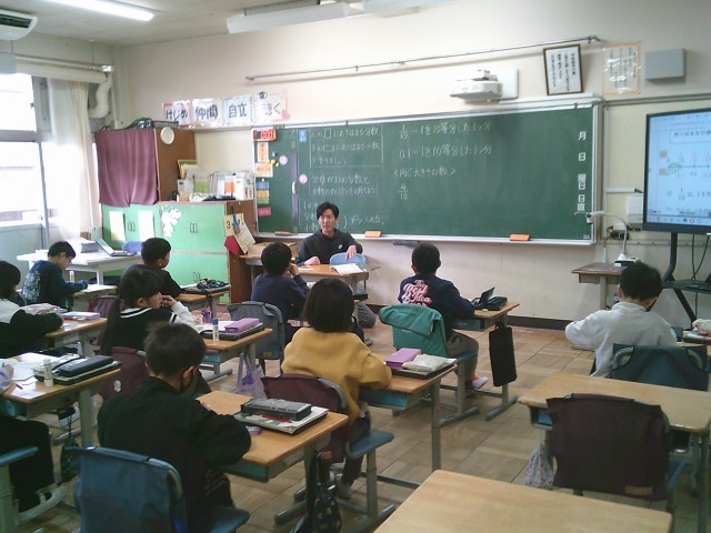 28日(水)1時間目、3年生は算数の時間でした。「分数」の学習です。今回は、「分母が10の分数と小数の関係を調べよう」をめあてに取り組んでいました。「0.4」と同じ分数は何分の何か等、子どもたちは理由も付けて考えていました。