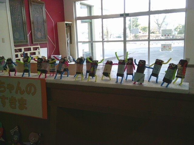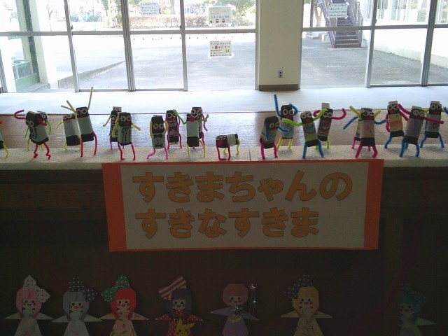 29日(木)、1年生が図画工作の時間に作った「すきまちゃん」が1階プレイルーム本棚の上に並びました。モールで作った手や足に動きがあり、とても可愛らしいです。