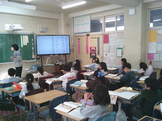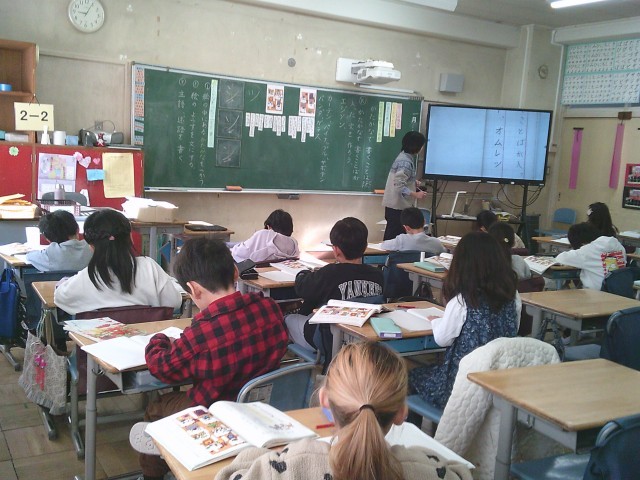 29日(木)1時間目、2年2組は国語の時間でした。講師の先生との学習です。今回は、「かたかなで書く言葉が入った文を作ろう」をめあてに取り組みました。文作りの前に、間違いそうなかたかな表記の練習をしました。「エジソン」の「ジソン」の3文字、「オムレツ」の「ツ」などです。繰り返し学習することで定着を図っています。