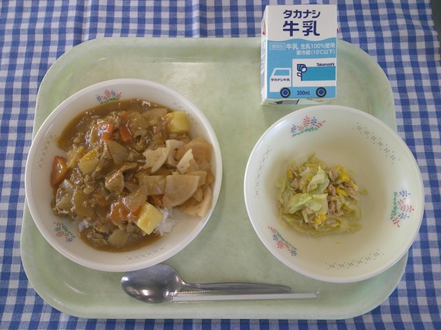 30日(金)の献立は、ポークカレーライス、手作り福神漬け、キャベツとツナのソテー、牛乳です。