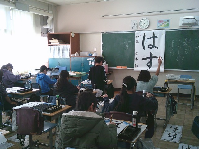 30日(金)3・4時間目、4年1組は書写の時間でした。今回はひらがなで「はす」と書きました。子どもたちは、曲がりや結びに気を付けながら書きました。