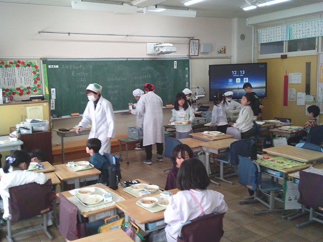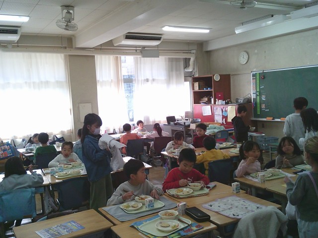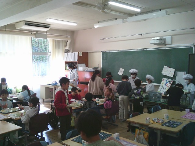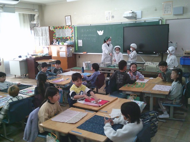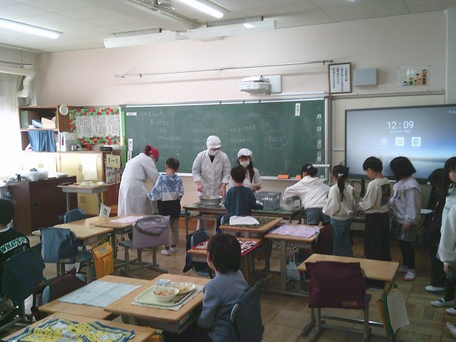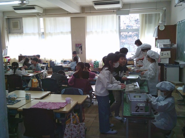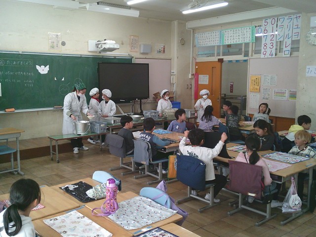 2日(月)、1年生、2年生の給食準備の様子です。当番の子どもたちは身支度を整え、自分の担当する仕事を黙々と行っていました。