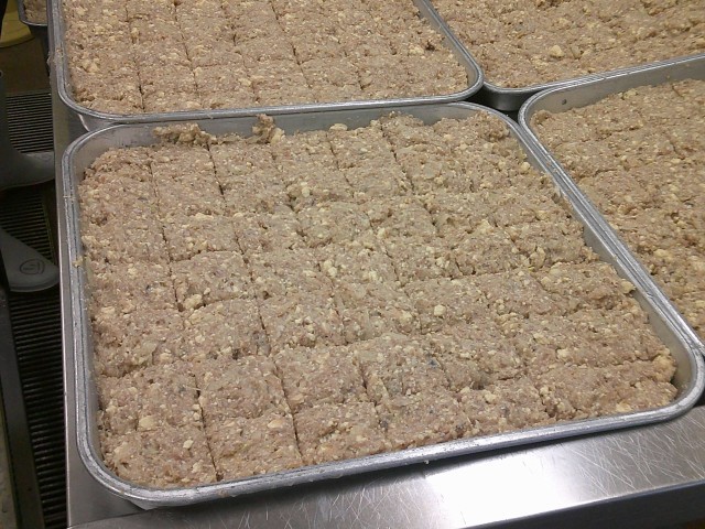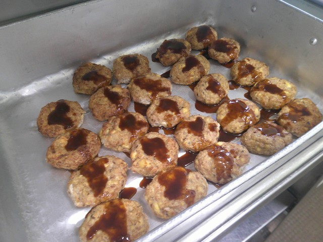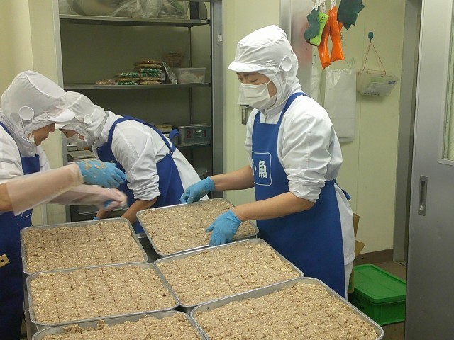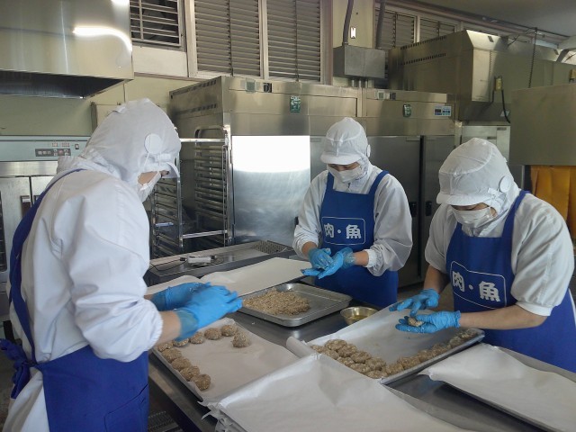 今日は節分です。季節を分けるという意味の節分は、立春、立夏、立秋、立冬の4回あります。その中でも春は1年のはじまりとされ、立春の前の日に邪気を払い、病気にならずに元気に過ごせるように祈りながら豆まきを行います。給食では、大豆と昆布のご飯と、いわしを使ったいわしハンバーグを提供しました。写真はいわしハンバーグを作っている様子です。