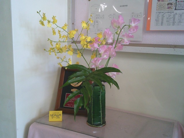 職員用玄関の生け花が新しいものに変わりました。黄色、桃色、緑色がありとてもきれいです。