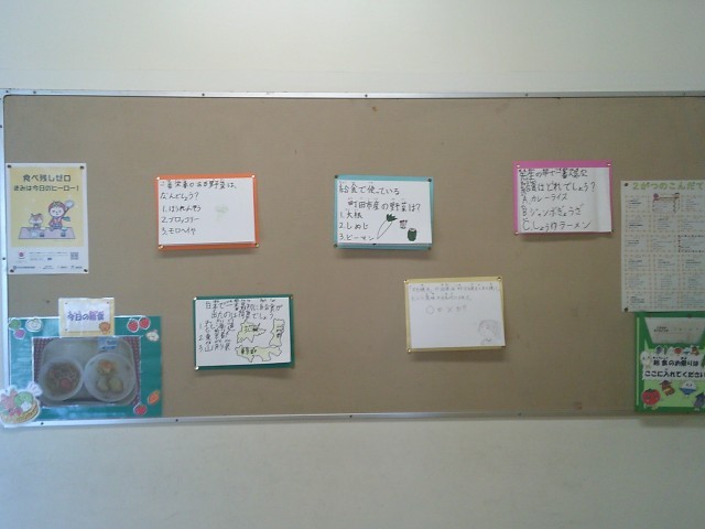 3日(火)、2階廊下の給食用掲示板に「給食クイズ」が登場しました。給食委員会の5年生と6年生が考えたものです。
