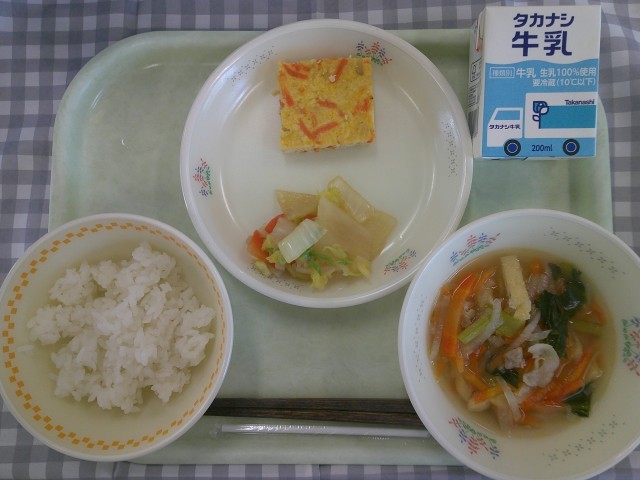 4日(水)の献立は、ご飯、千草焼き、白菜の浅漬け、沢煮椀、牛乳です。