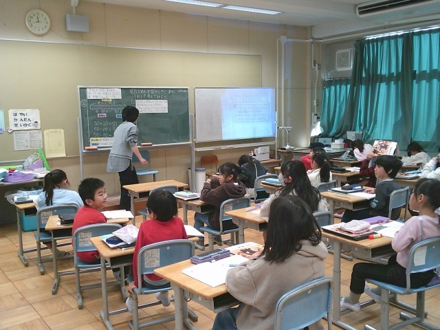 4日(水)4時間目、2年生は算数の時間でした。「たし算とひき算(2)」の学習です。今回は問題文を読み、その場面を図や式に表して考えました。子どもたちはテープ図を書いて、「27+□=34」の式を立てることができました。