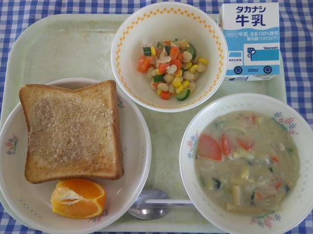 6日(金)の献立は、セサミトースト、マカロニのクリーム煮、ビーンズサラダ、果物(はるみ)、牛乳です。