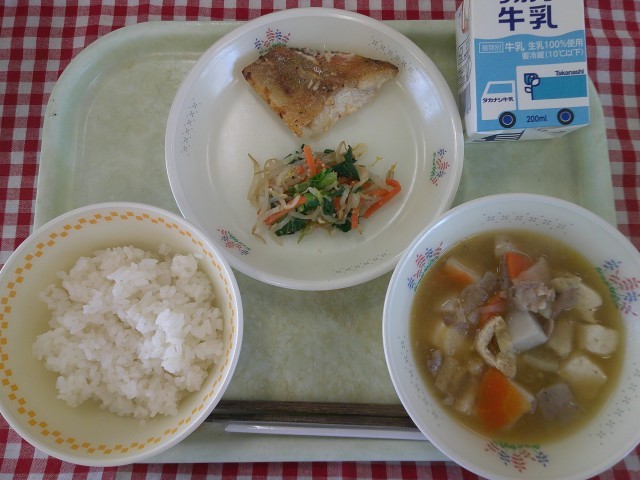 9日(月)の献立は、ご飯、赤魚のみそマヨネーズ焼き、ごま和え、のっぺい汁、牛乳です。