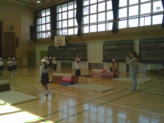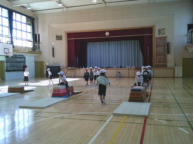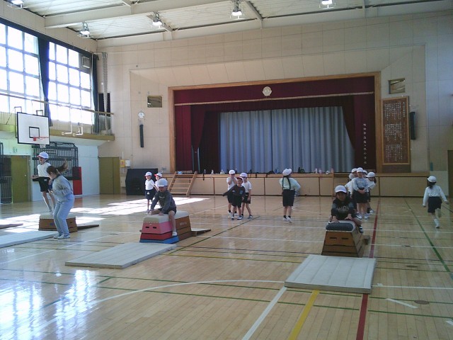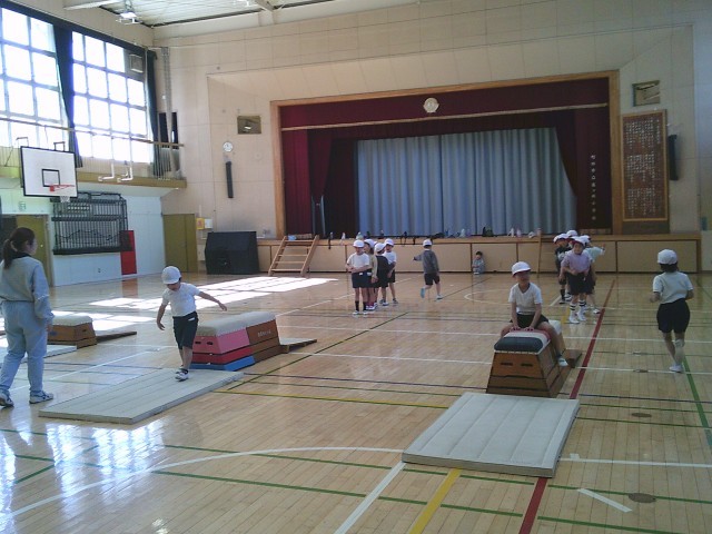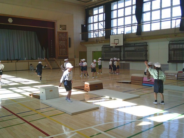9日(月)4時間目、1年2組は体育の時間でした。「跳び箱あそび」に取り組んでいました。いろいろな跳び方で跳んだり、跳び方を工夫したりして楽しみました。