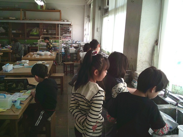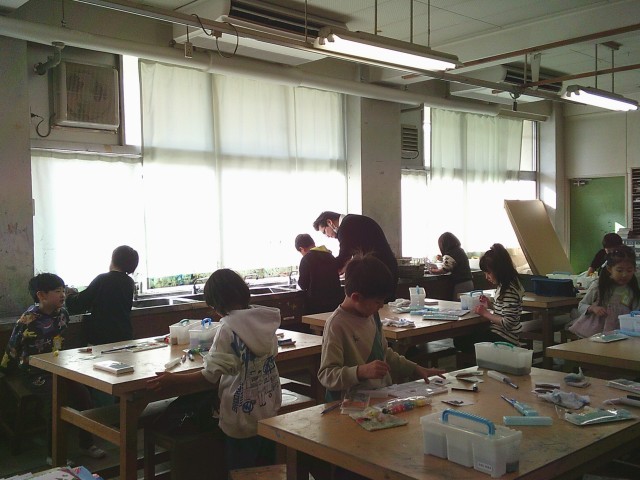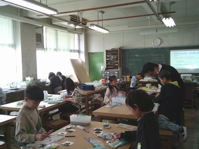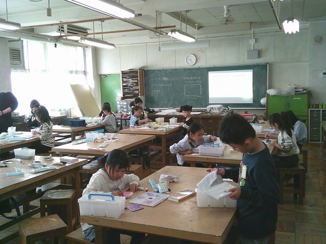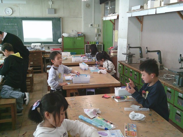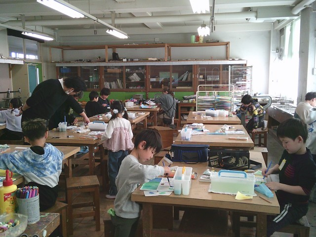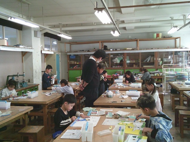 10日(火)1・2時間目、1年1組は図画工作の時間でした。今回も図工室で学習しました。先週途中まで描いた「できたらいいな こんなこと」の絵に絵の具で色をつけました。子どもたちは絵の具を混ぜて、水色や紫色などを作って楽しんでいました。