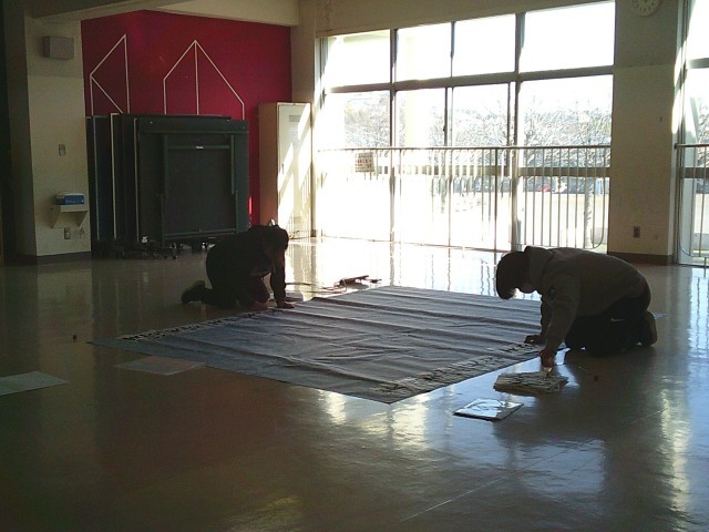 10日(火)2時間目、2階プレイルームでは4年の先生二人が子どもたちが書いた書写の作品を1枚ずつ糊付けしていました。4年生の作品は町田市立国際版画美術館に展示されます。