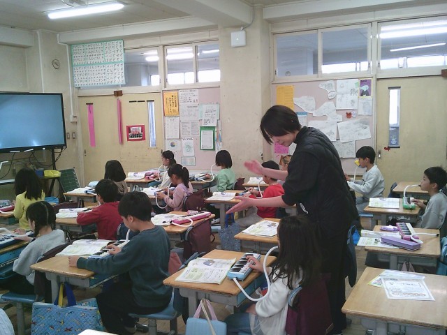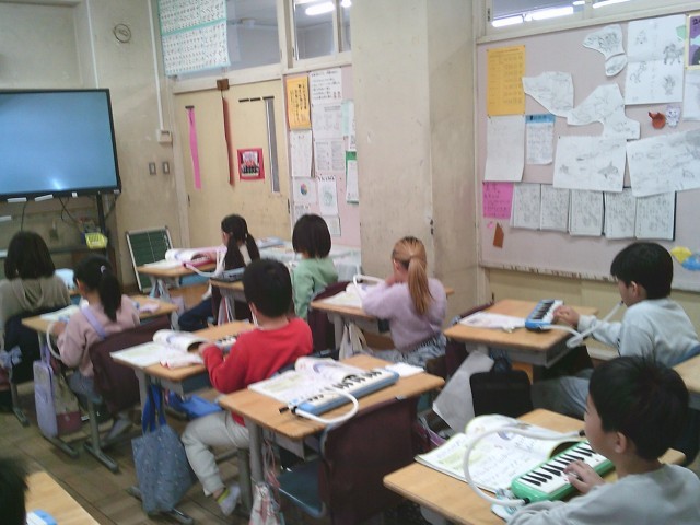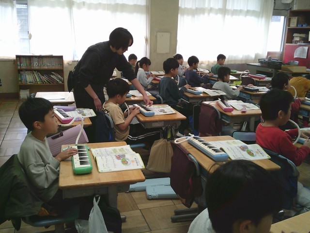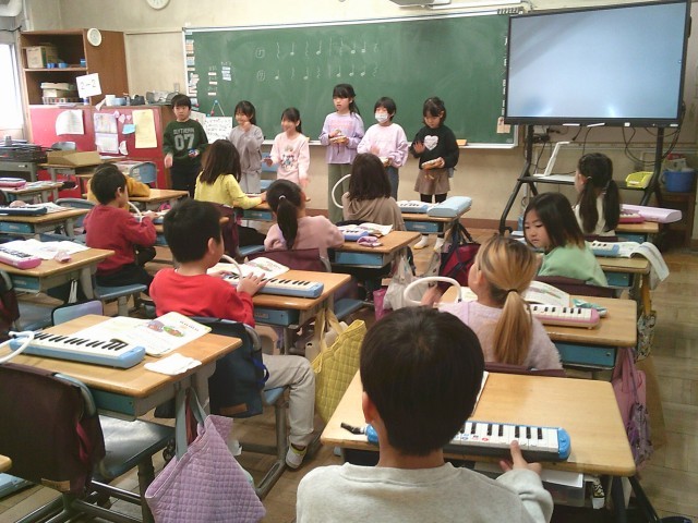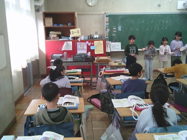 12日(木)2時間目、2年2組は音楽の時間でした。2時間目だけ音楽室が使えなくなり、急遽教室で行いました。最初に今月の歌「赤い屋根の家」の練習をしました。次に、「こぐまの二月」の合奏練習をしました。鍵盤ハーモニカグループを旋律パートと伴奏パートに分けたり、タンバリンやカスタネットなどの小型打楽器に分けたりして練習をしました。