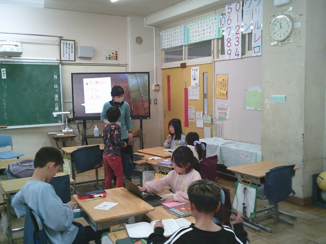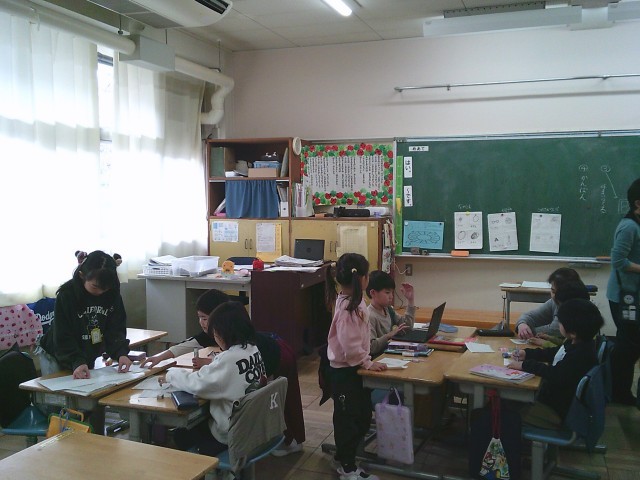 16日(月)4時間目、1年1組は国語の時間でした。「ものの名まえ」の学習です。お客さんとお店屋さんに分かれて売ったり買ったりするための準備をしていました。今回のめあては「しょうひんをつくろう」です。子どもたちは、画用紙に物の名前や絵を大きく描いていました。