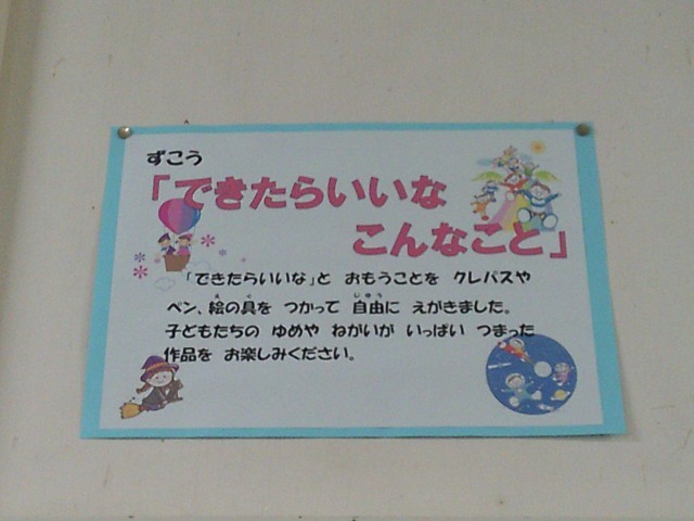1年生の廊下には、図画工作の時間に4時間かけて描いた「できたらいいな こんなこと」の絵が登場しました。作品を仕上げるために絵の具で塗った背景がとてもきれいです。