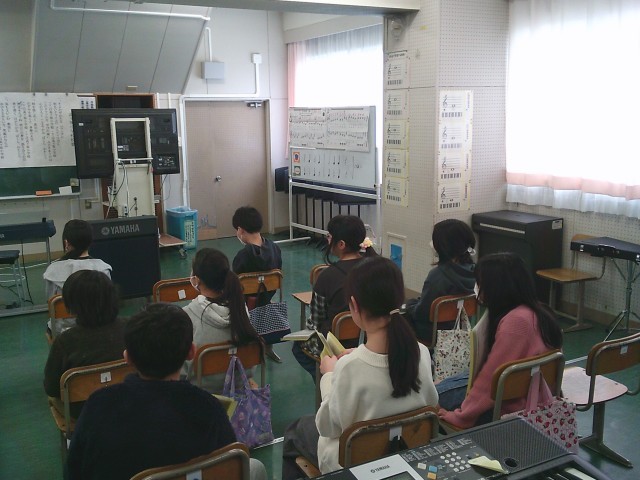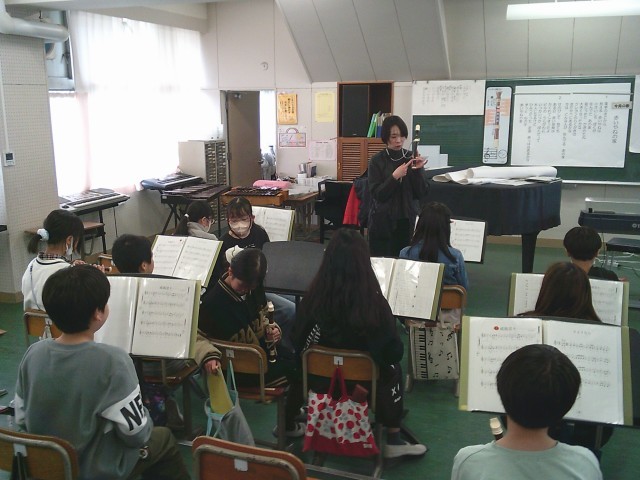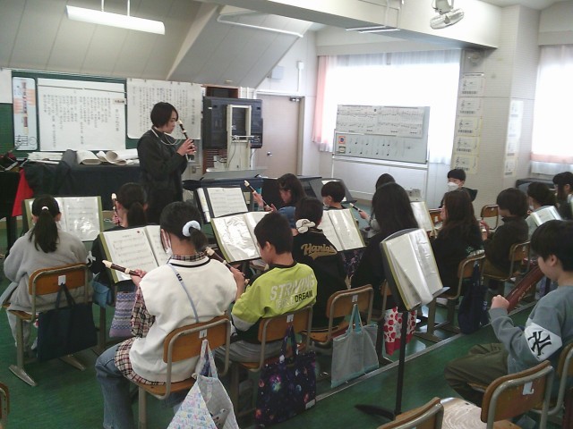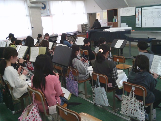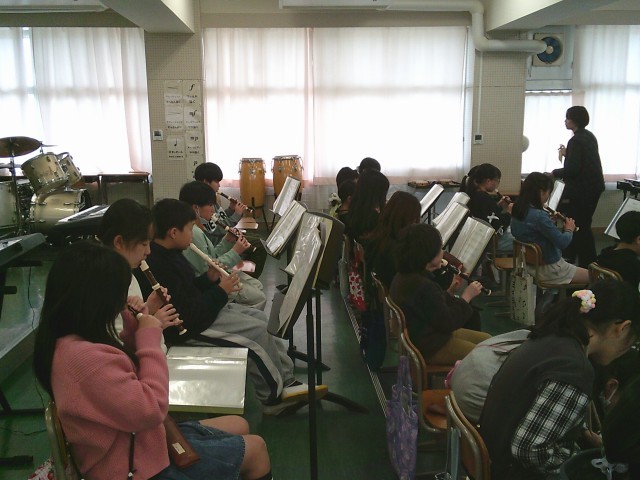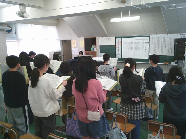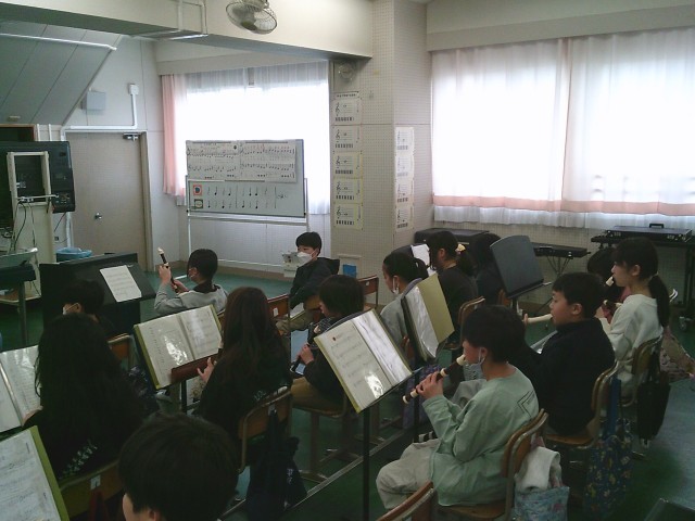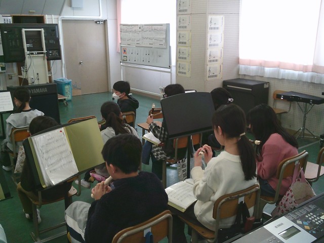 17日(火)4時間目、5年2組は音楽の時間でした。今月の歌「赤い屋根の家」を歌ってから、卒業式で歌う「絆」の練習をしました。その後、リコーダーを出して「威風堂々」の練習をしました。下のドの音を安定して出す方法を教えてもらってから、子どもたちは自分の小指の位置を意識していました。