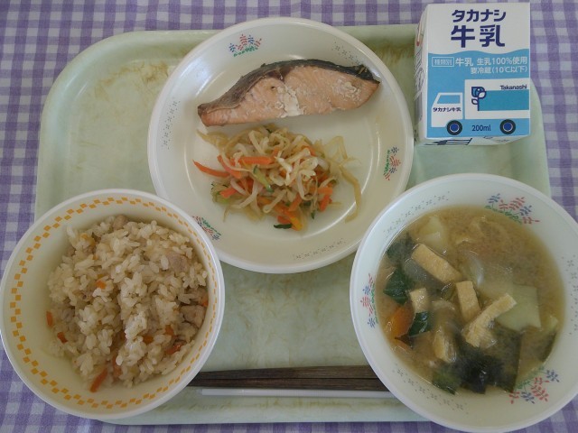 19日(木)の献立は、たきこみご飯、鮭の照り焼き、切干大根和え、具だくさんみそ汁、牛乳です。