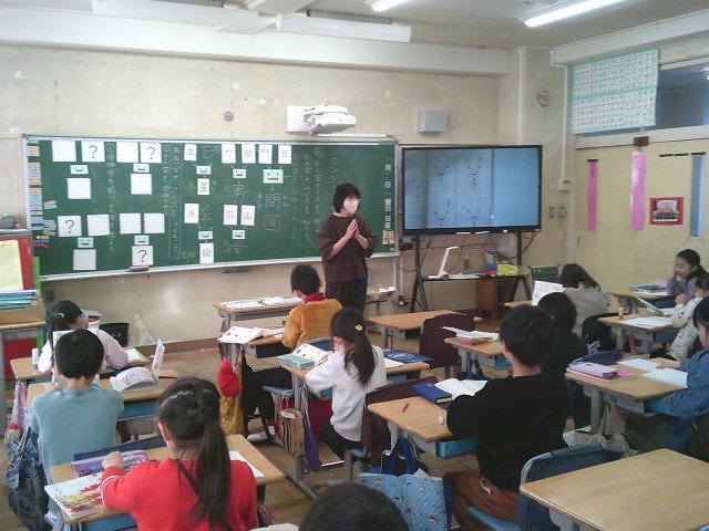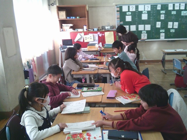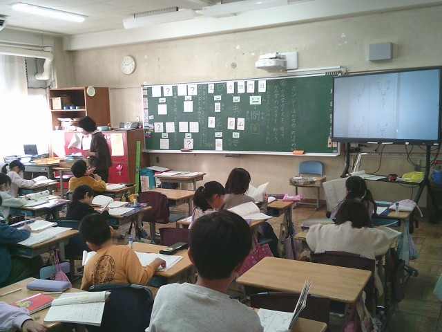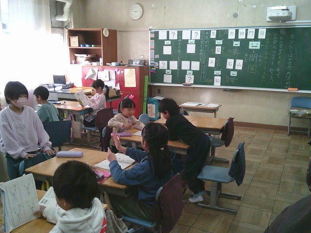 19日(木)1時間目、2年2組は国語の時間でした。「カンジーはかせの大はつめい」の学習です。今回は、漢字クイズを作って漢字のつくりを学びました。例えば、「日と門を合わせて間」、「石と山を合わせて岩」などです。子どもたちは各自で問題を考えてから、隣りの人と向かい合ってすわり、クイズ屋さんを始めました。