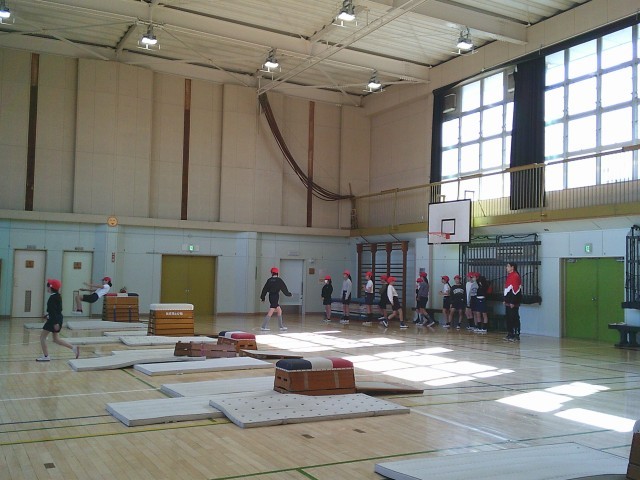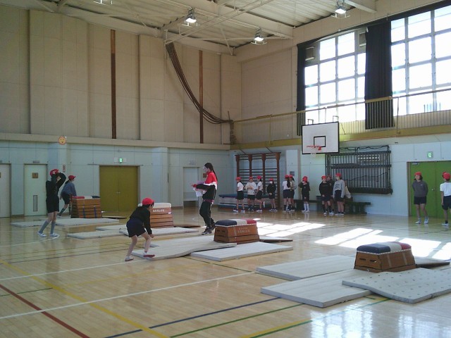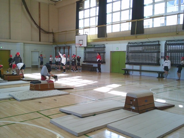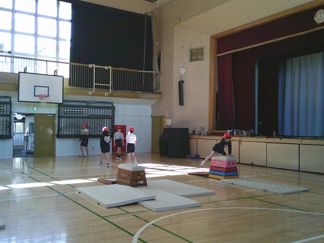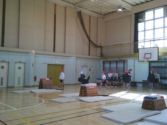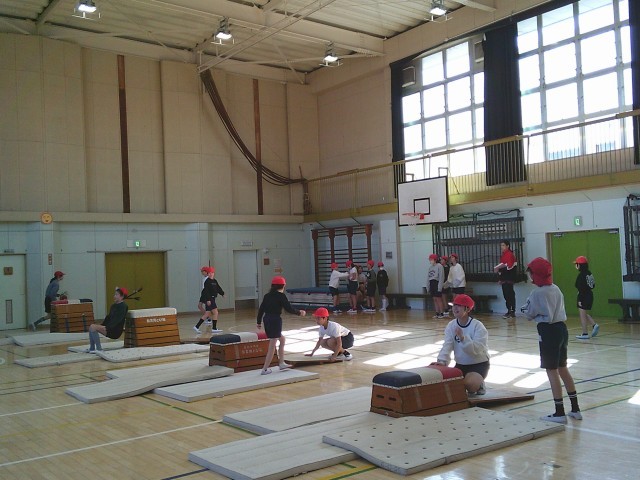 19日(木)3時間目、5年1組は体育の時間でした。跳び箱で開脚跳びと台上前転の練習をしています。跳び箱の高さは自分で選び、場所を変えることをしながら、「できた」という実感を味わっていました。