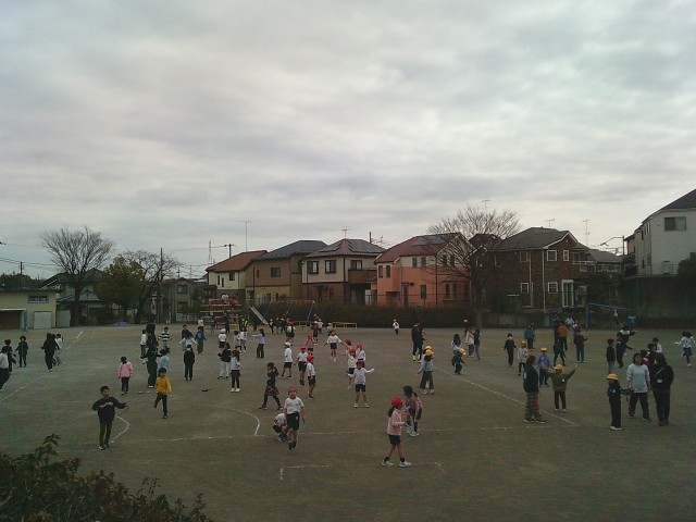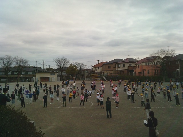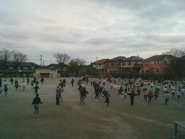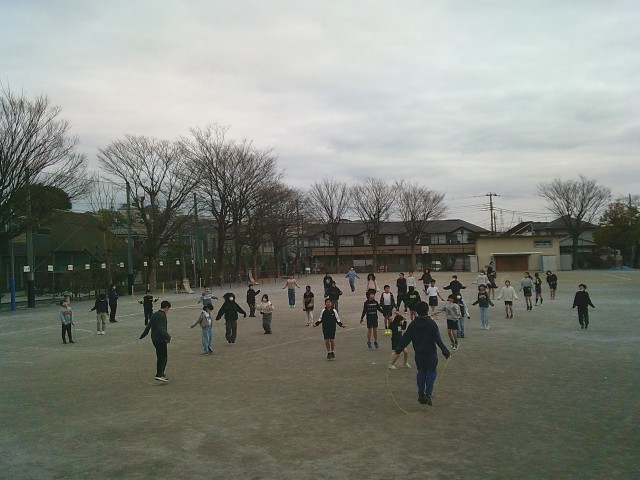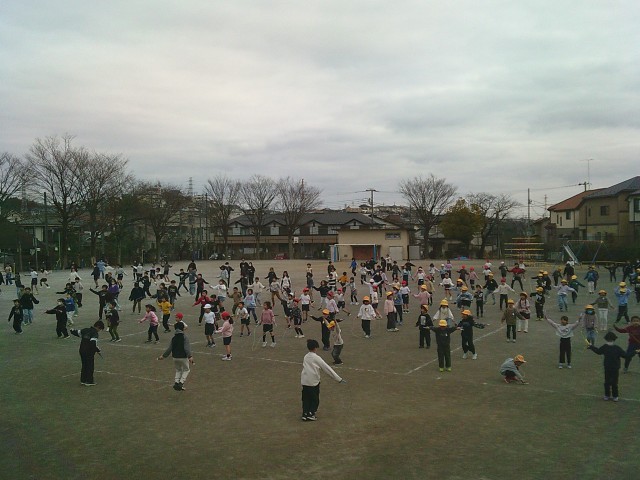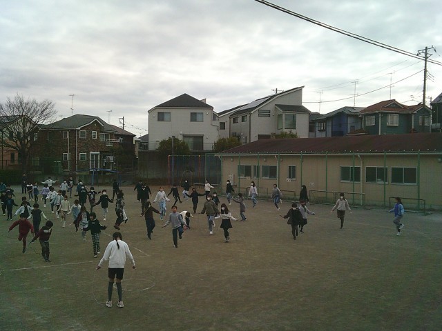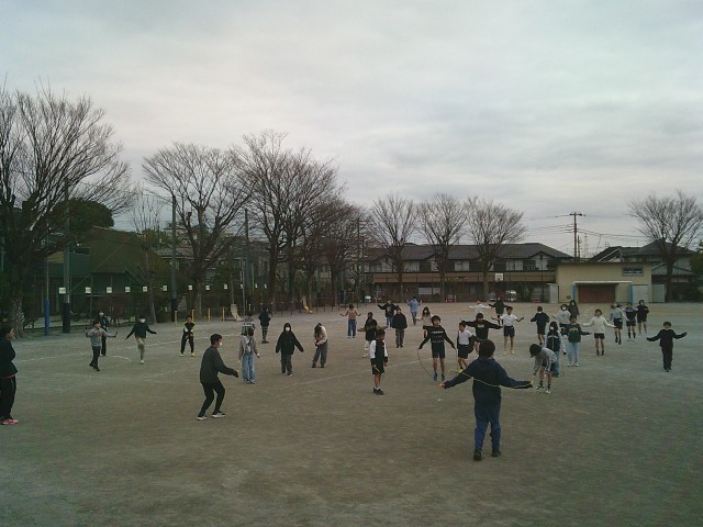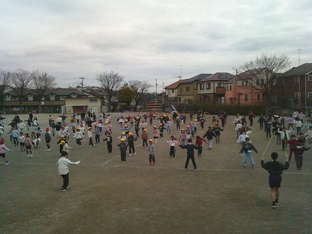 20日(金)中休み、全学年の子どもたちは短なわを持って校庭に集合しました。今週から始まった「短なわ旬間」の「リズムなわ跳び」をします。朝会と同じように並び、学童側に6年生、道路側に5年生がいます。体育委員会の5年生と6年生が前に出て手本を示します。月曜日、水曜日もリズムなわ跳びをしたので、今回が3回目になります。ドラえもんのテーマ曲に合わせて約3分間、技を入れながら楽しく跳びました。その後はチャイムが鳴るまで音楽をかけ続けますが、参加は自由です。そのままリズムなわ跳びをする人、遊具で遊ぶ人、教室に戻る人など様々です。
