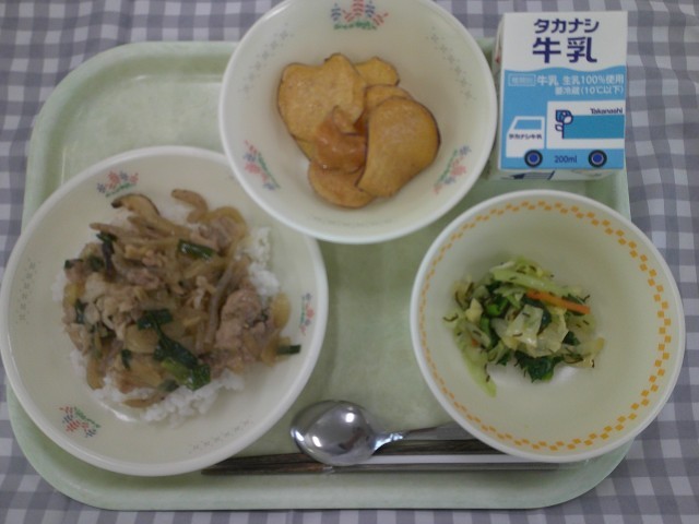25日(水)の献立は、豚丼、さつま芋チップス、野菜の昆布和え、牛乳です。
