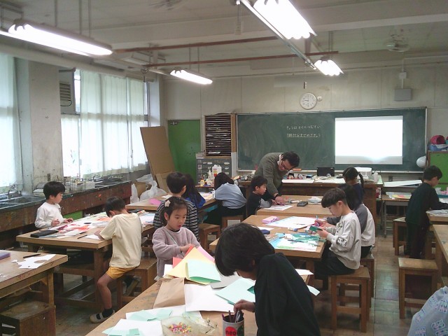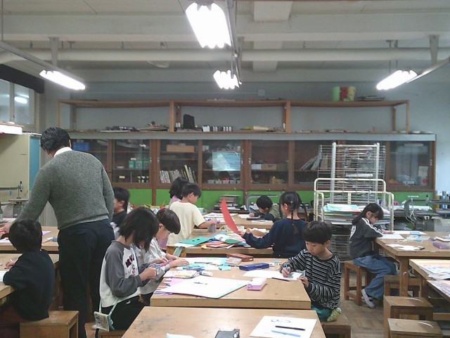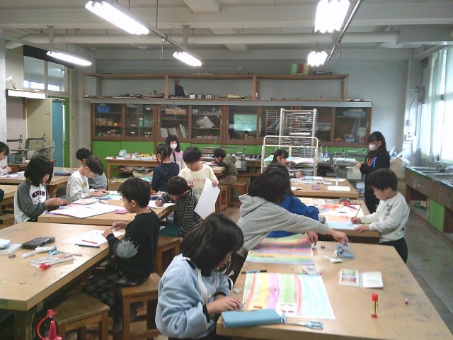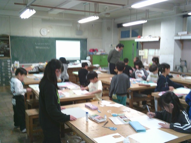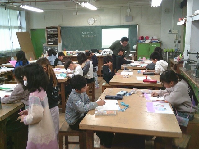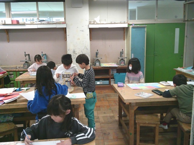 25日(水)1・2時間目、2年1組は図画工作の時間でした。「ふしぎな ぼうし」と題した工作を完成させた子どもたちは、今回、「その帽子を被った自分」を絵に描きました。背景をチョークで塗り、手でぼかしたり広げたりして描いていました。