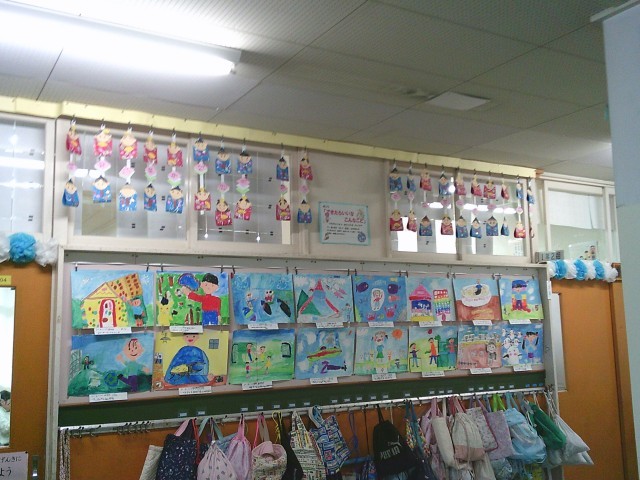 1年生の廊下には、前日の図画工作の時間に作った「楽しい ひなまつり」の作品が登場しました。お雛様とお内裏様の間には3枚の色画用紙を重ねた「菱餅」があります。廊下や教室に子どもたちの作品が飾られているのは、とてもすてきなことです。