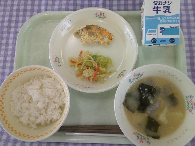 26日(木)の献立は、ご飯、たらのあけぼの焼き、えのきサラダ、呉汁、牛乳です。