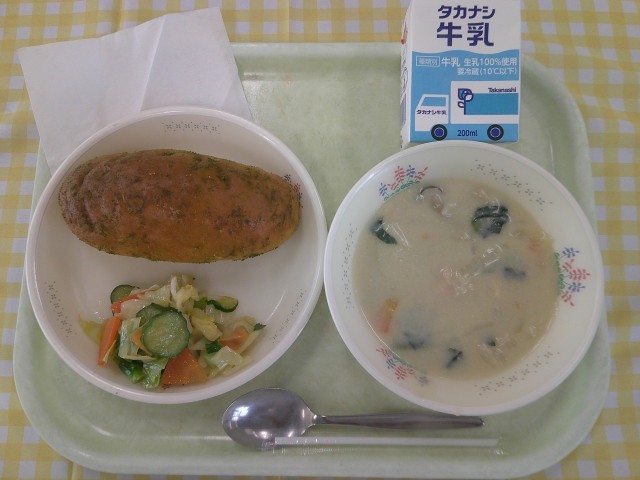 3日(火)の献立は、抹茶キャラメル揚げパン、(きなこ揚げパン:6年生のみ)クリームシチュー、菜の花サラダ、牛乳です。