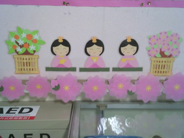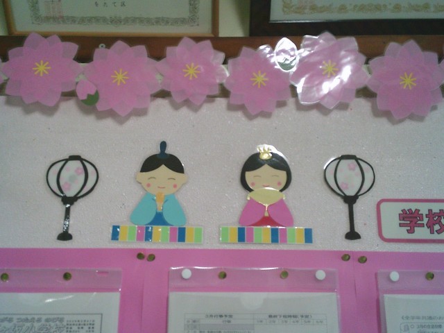 3日(火)は「ひなまつり」です。職員用玄関の掲示板はひなまつり仕様になりました。スクールサポートスタッフが月ごと、行事ごとに飾っています。