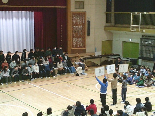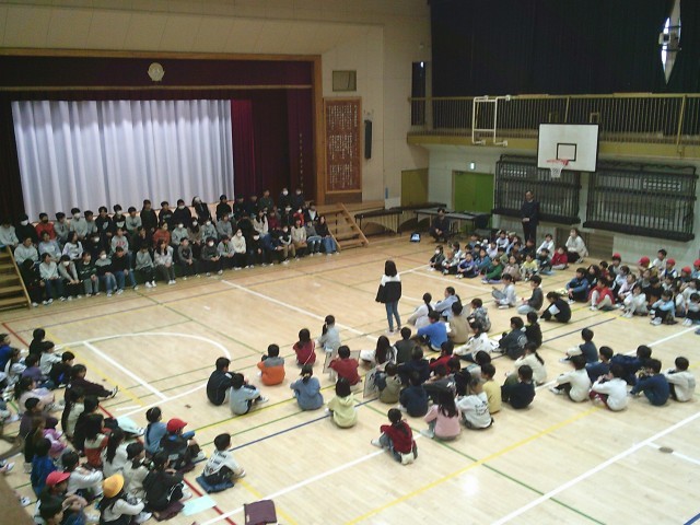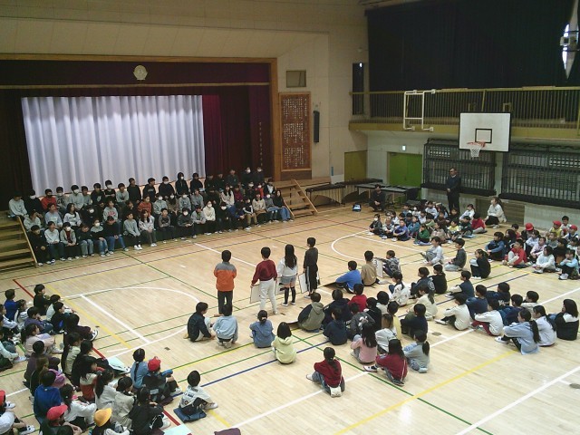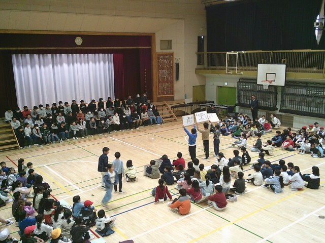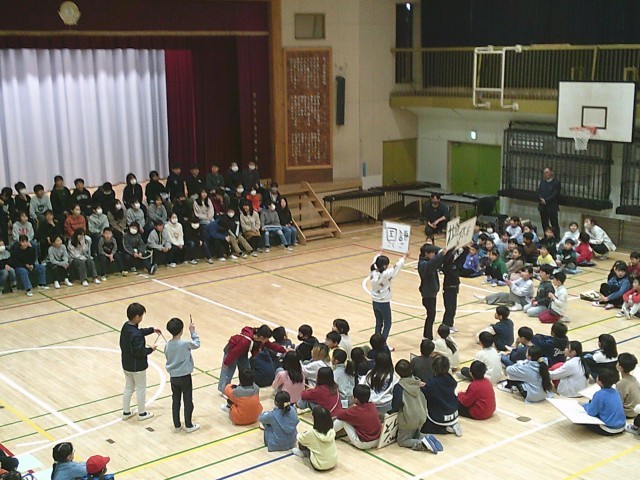 3日(火)6年生を送る会の様子です。各学年からの贈り物を順に披露しています。3年生は6年生のクイズを4問出題しました。「3年生で初めて書いたお習字は何」「6年2組の先生が好きな色は」「入学して初めて食べた給食の献立は何」「6年1組の先生が好きな教科は」です。3年生が指名した6年生のみが3択で答えました。正解するとメダルのプレゼントがあり、指名された6年生も思わず喜んでいました。