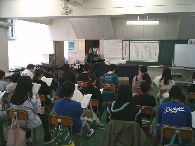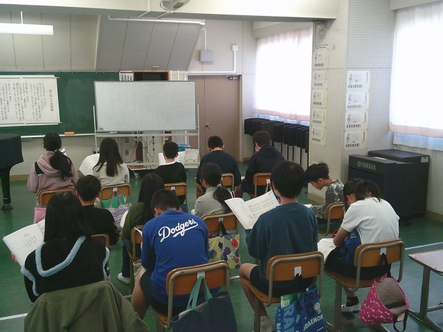 4日(水)3時間目、6年1組は音楽の時間でした。卒業式で歌う曲の練習をして、最後に国歌の練習をしました。楽譜を見ながら、息継ぎをするところに気を付けて歌っていました。