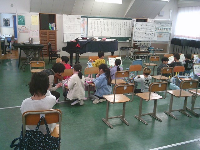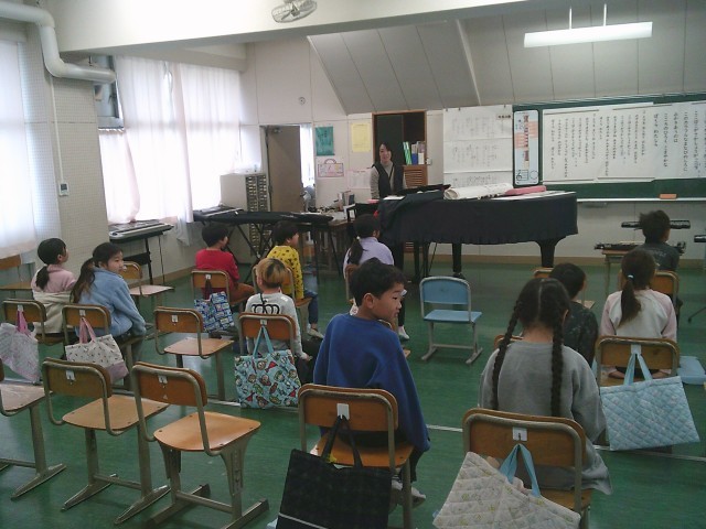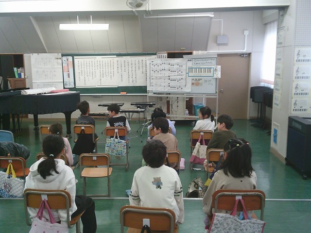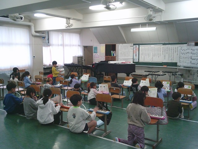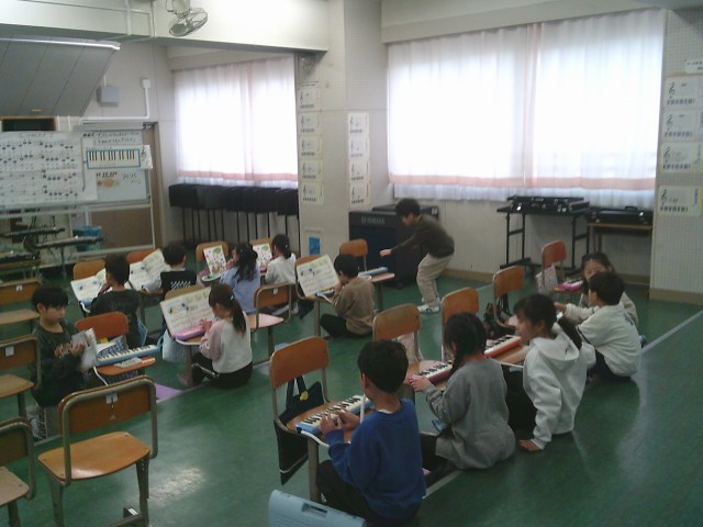 6日(金)2時間目、1年2組は音楽の時間でした。「こいぬのマーチ」に取り組んでいました。最初は先生のピアノに合わせて階名読みで歌いました。次に鍵盤ハーモニカを出して練習をしました。その間、音楽の先生が一人一人の音や指使いを見ていました。