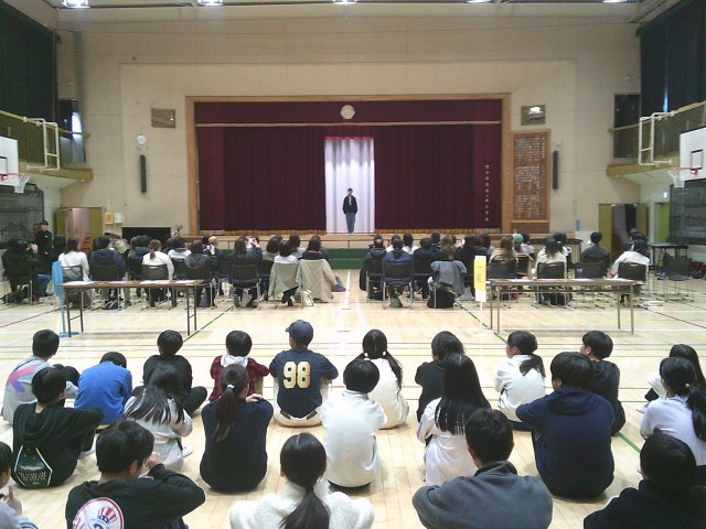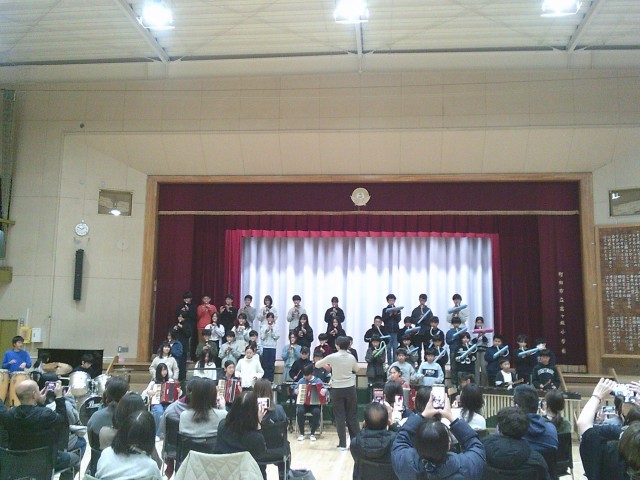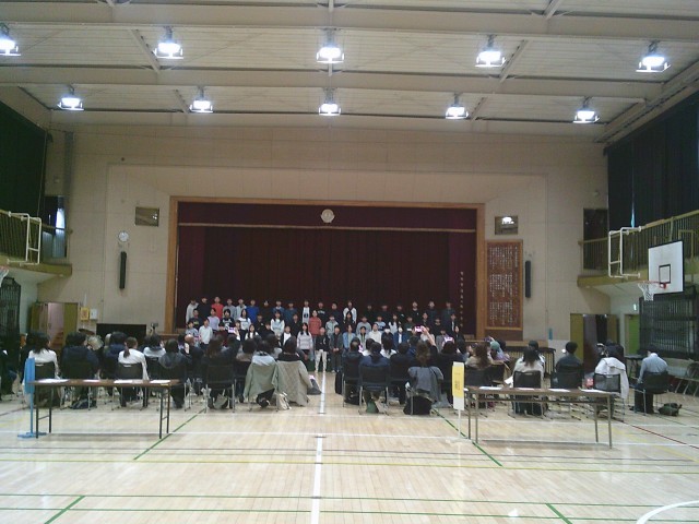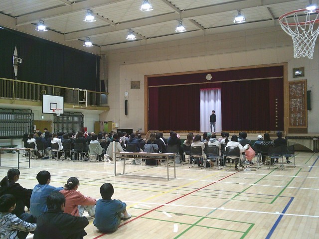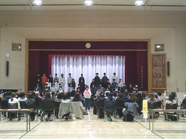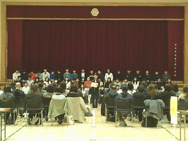 6日(金)5時間目、6年生は卒業を前に「感謝の会」を開きました。一人ずつステージの中央に出て将来の夢や中学校で頑張りたいことなどを大きな声で発表しました。次に、詩「生きる」の群読をしました。最後は、「sing sing sing」の合奏を披露しました。司会進行は、実行委員が担当しました。プログラムが全て終わったところで、合奏に対してアンコールをいただき、子どもたちはリラックスした笑顔で演奏を楽しんでいました。